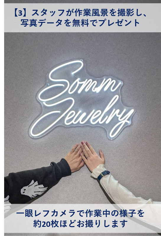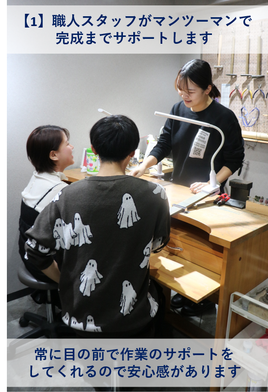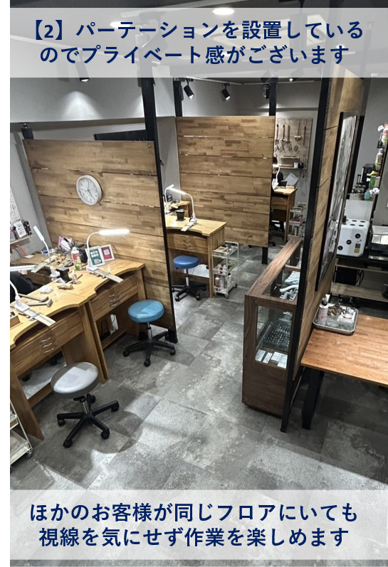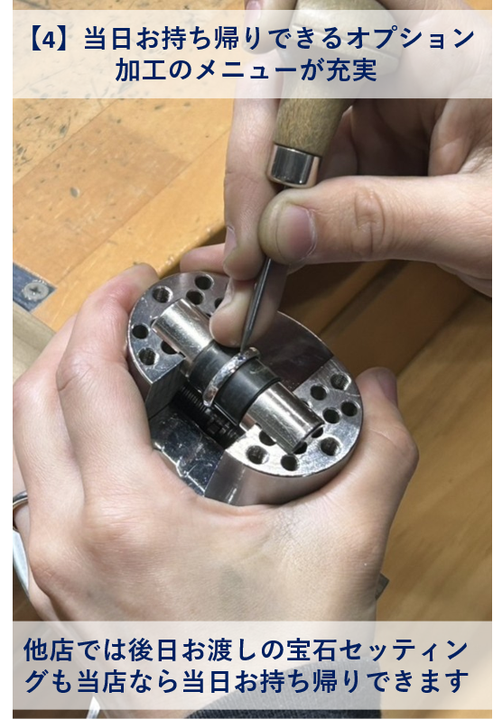 アフターメンテナンスでは、サイズ変更、磨き直し、宝石紛失による留め直し、つなぎ目(ロウ付け箇所)のワレのお直し、メッキ剥がれによるかけ直しなどを無期限・無料でご対応させていただきます。